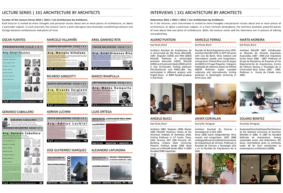 Desde el año 2012 se lleva a cabo el ciclo de charlas y entrevistas llamado 1x1 Obras de Arquitectura por Arquitectos en los que convocamos a arquitectos profesionales a responder una pregunta : ¿Qué miran los arquitectos cuando miran arquitectura? Se trata de una serie de charlas donde, en cada ocasión, un arquitecto invitado expone su visión de una o varias obras de otro arquitecto, o bien propone el seguimiento de un problema específico de la disciplina en distintos proyectos. La elección del tema y las obras dependerá en todos los casos del invitado. Creemos que el mirar de un arquitecto traza, especialmente en las obras de otros arquitectos, caminos inesperados; puede detenerse minuciosamente en un detalle, soslayando cuestiones de mayor importancia, y resignificar todo un trabajo a partir de ese detalle. La mirada de un arquitecto establece relaciones allí donde (hasta el momento) no había nada, construye, explora y se apropia de las obras a través de sus recorridos visuales.