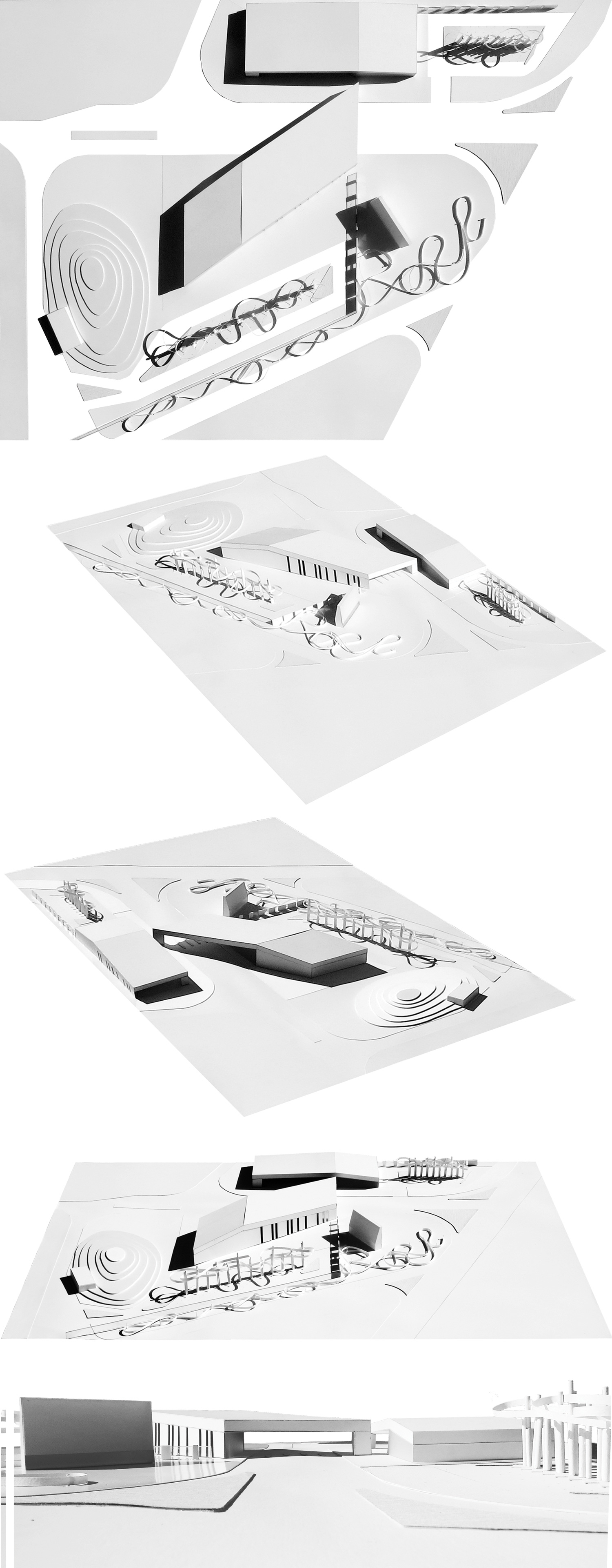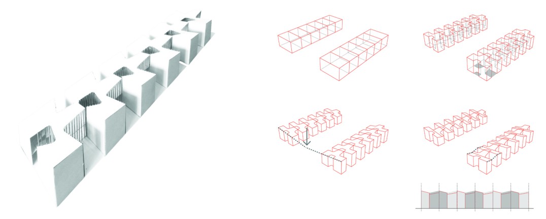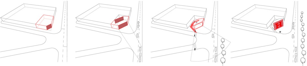 The buildings are generated by the position of two gates, one vehicular and one pedestrian. The transversal axes define the occupancy surfaces at both sides of the access road. Each gate affects the height of the opposing volume. The roof planes are formed by the union of the projected edges. The added volumes complete the composition by positioning parallel to the access road deepening the entrance experience.