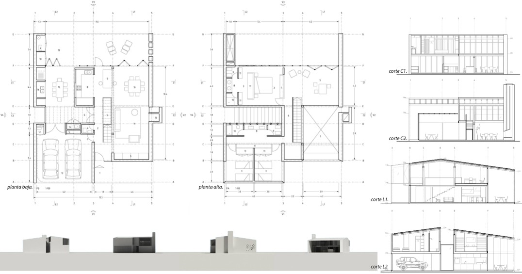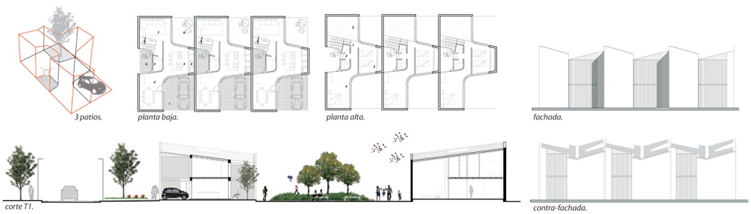 The houses are targeted at young families. The social spaces on the ground floor are articulated by the kitchen understood as the core of the house. Three different patios allow distinctive uses as parking space, garden, and service. Living room and dining room are use indistinctly. On the first level, two bedrooms and a bathroom complete the plan.