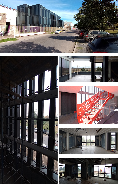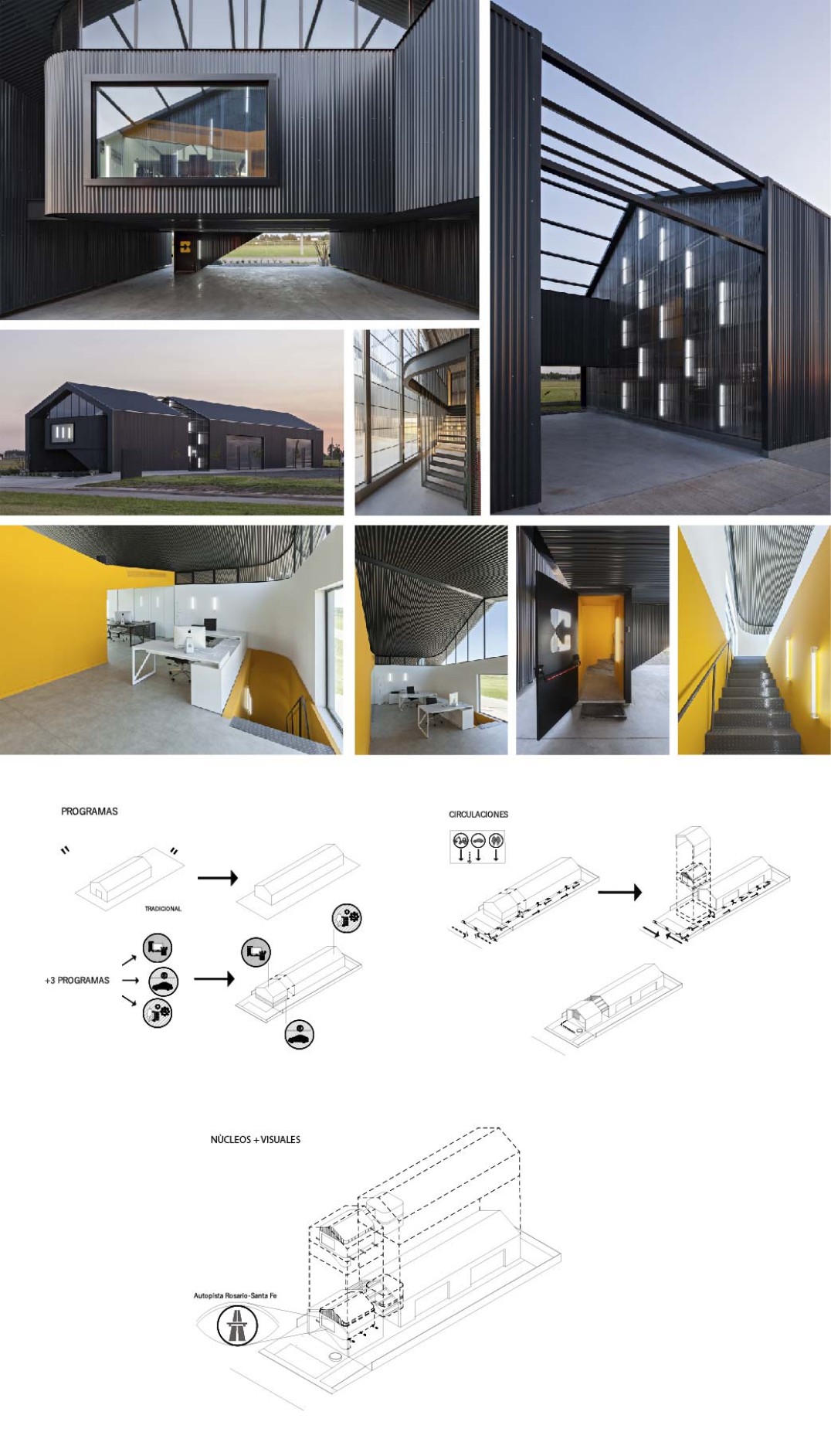 Ubicado en un lote frentista a la autopista Rosario Santa Fe, el edificio se recuesta sobre un lateral para dejar paso a la circulación permanente de vehículos. Así mismo, el sector de oficinas se eleva para dejar lugar al estacionamiento y de esta manera, privilegiar las vistas hacia el horizonte. Este horizonte no se revela francamente a través de las aperturas, sino que por medio de la elección material se presenta distorsionado y difuso hacia el paisaje industrial.