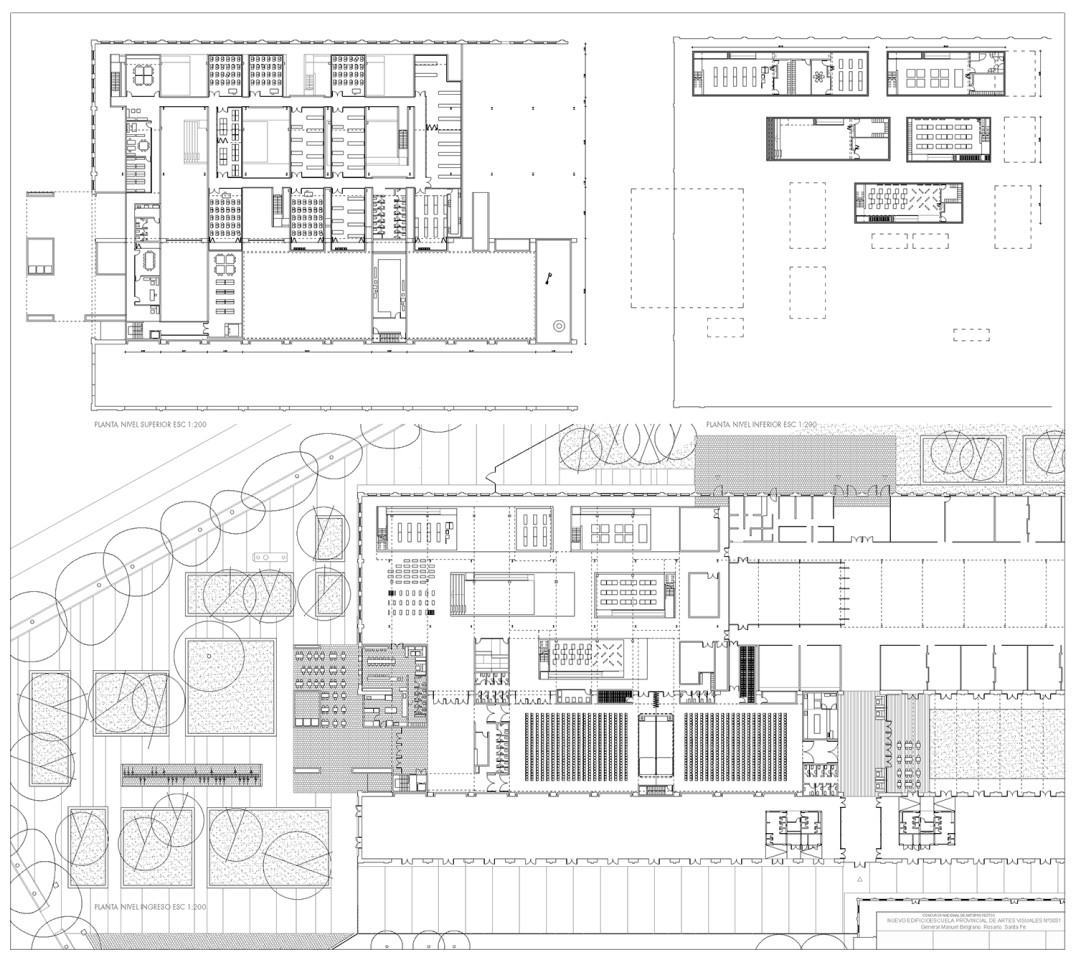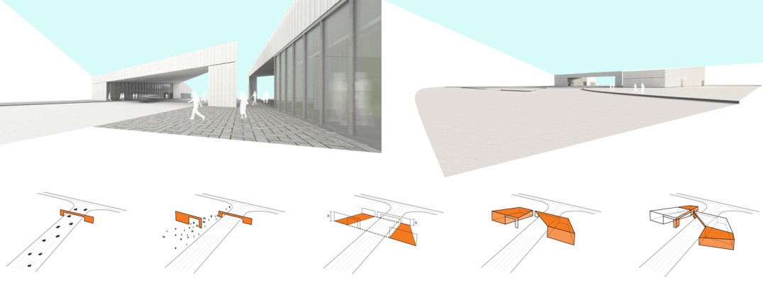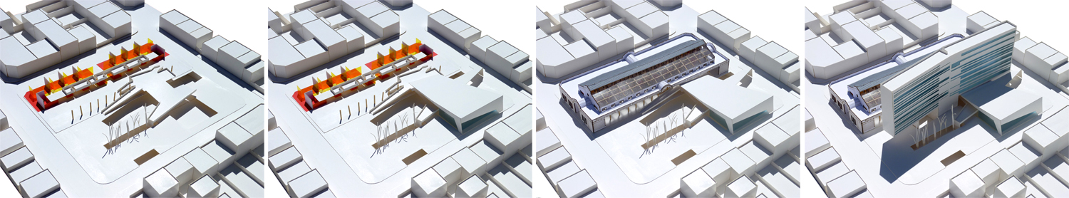 Los edificios se generan a partir de los dos pórticos de ingreso vehicular y peatonal. Los ejes transversales definen las superficies a ocupar a ambos lados de la calle. Cada pórtico afecta la altura del volumen enfrentado. Los panos de cubierta se constituyen a partir de la unión de las aristas proyectadas. Los volúmenes adicionados completan el conjunto posicionándose paralelos a la calle flanqueando y profundizando el ingreso.