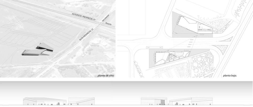 El ingreso al Parque Industrial San Lorenzo se encuentra flanqueado por dos edificios de mismo carácter que albergarán equipamientos diferentes. Sus volúmenes actúan como puertas a la vez que las cubiertas se convierten en quinta fachada debido a la depresión topográfica del punto de acceso.