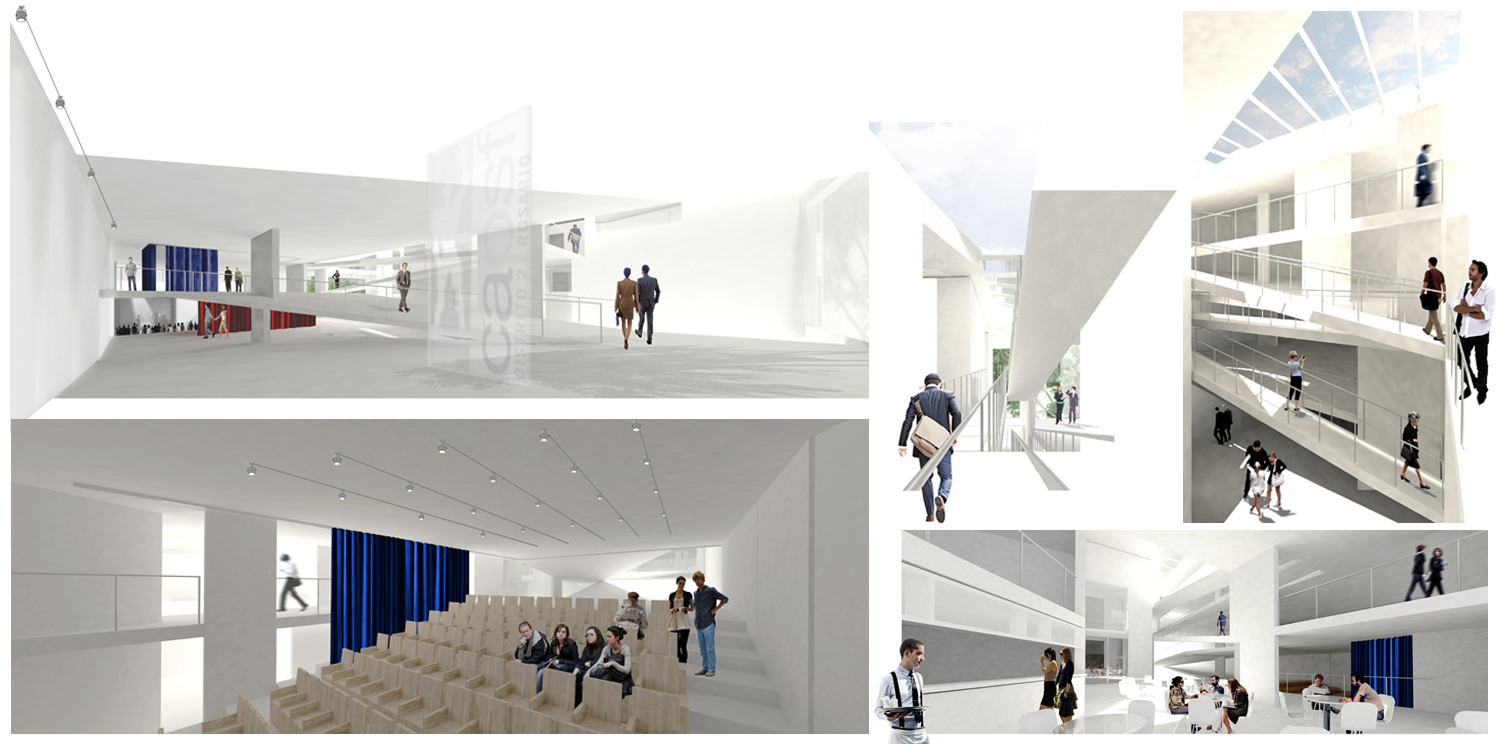 Espacialmente conectadas con las áreas semi públicas, el nivel donde se encuentran las oficinas administrativas y de las autoridades de ambas instituciones, es jerarquizado por ……
