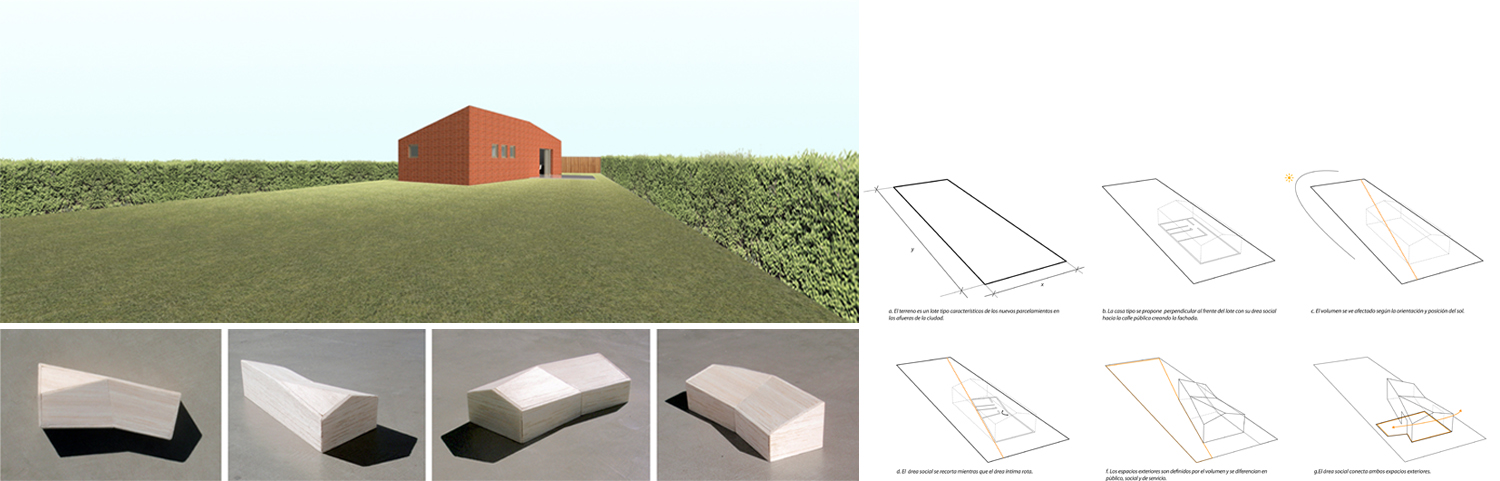 Una vivienda prototipo diseñada por encargo de un consorcio de un barrio abierto en las afueras de la ciudad de Rosario, que formará parte de una publicación dirigida a propietarios potenciales. Cumpliendo los requerimientos de superficie y presupuesto, la propuesta indaga en cuestiones de privacidad y apertura de los espacios de encuentro, teniendo en cuenta la cercanía de las viviendas linderas y la relación del interior con el exterior en un lote de estas proporciones. Al tratarse de un prototipo, la investigación aborda cuestiones generales tanto de situación como de tipo.