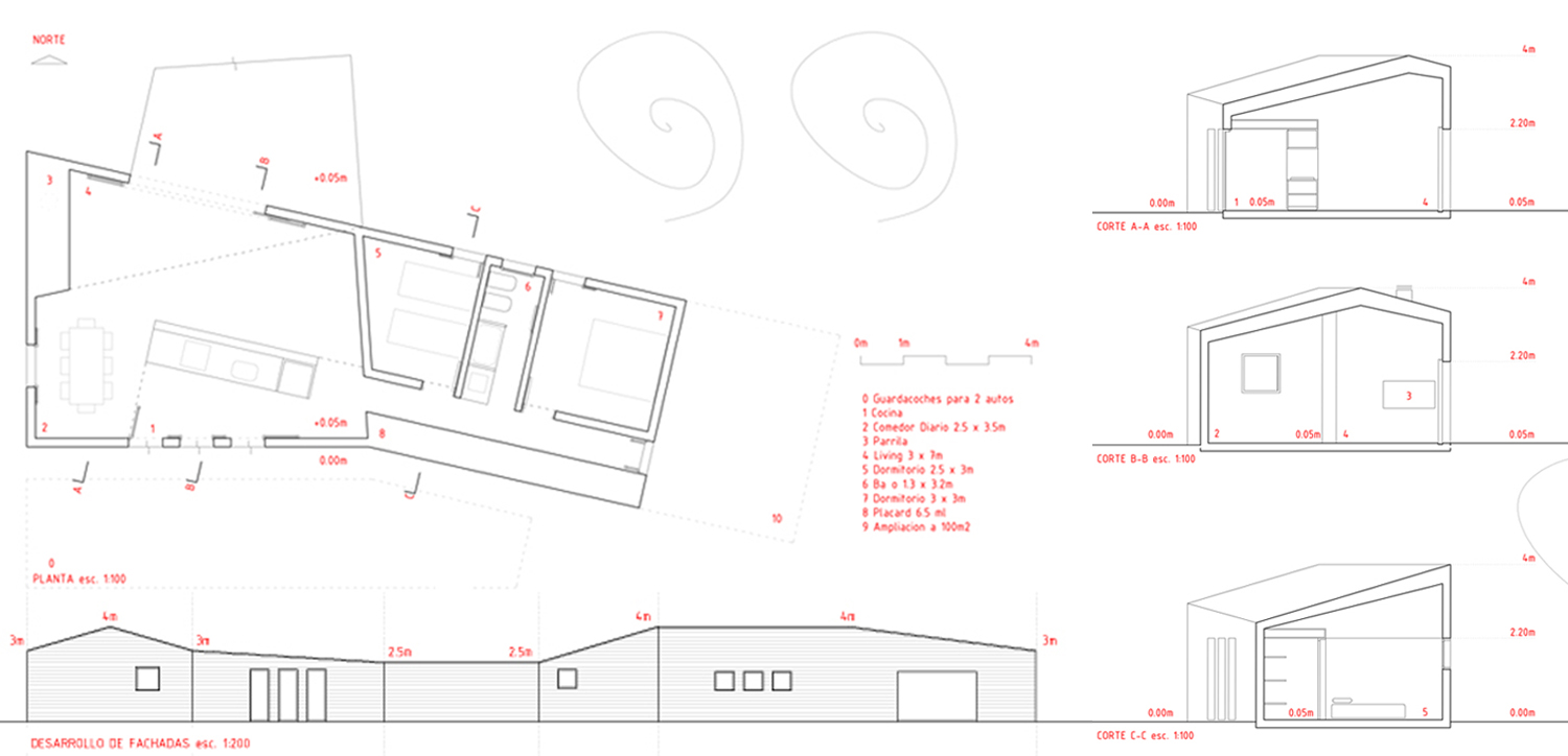 El proyecto completo es una vivienda de 196 m2 para residencia permanente y consta de cuatro unidades espaciales diferenciadas de acuerdo a su uso. Con el propósito de facilitar la construcción en etapas, el diseño propone una única unidad espacial que se repetirá y rotará de acuerdo a los requerimientos programáticos. Las dos primeras unidades construidas son el garage, que servirá además de quincho de invierno, y la galería o quincho abierto.
