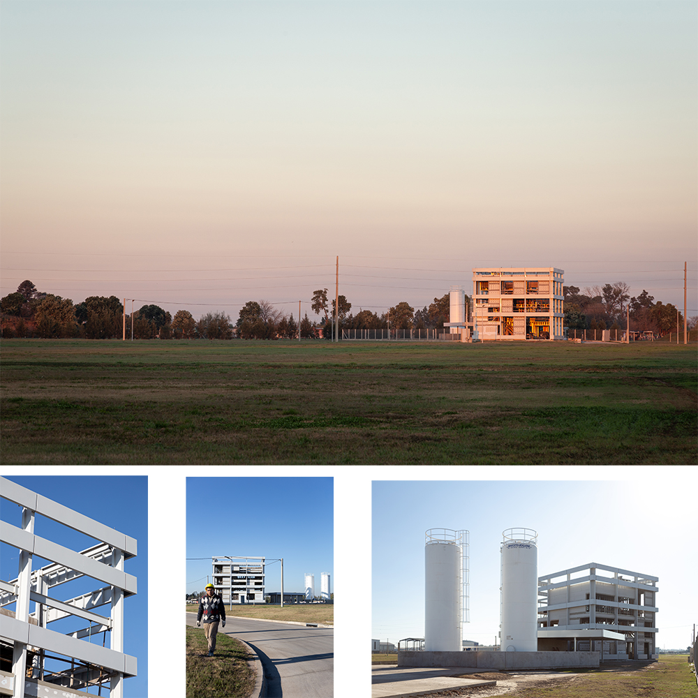 Located on a lot in front of the Rosario Santa Fe highway, the building leans on one side to make way for the permanent circulation of vehicles. Likewise, the office sector rises to make room for parking and in this way, privilege views towards the horizon. This horizon is not frankly revealed through the openings, but rather, through the material choice, it appears distorted and diffused towards the industrial landscape.