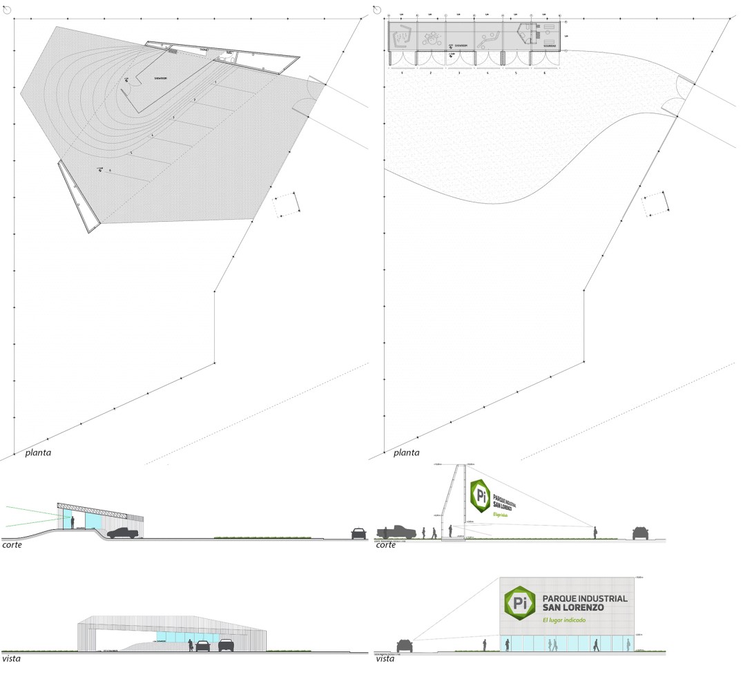 El ingreso al Parque Industrial San Lorenzo se encuentra flanqueado por dos edificios de mismo carácter que albergarán equipamientos diferentes. Sus volúmenes actúan como puertas a la vez que las cubiertas se convierten en quinta fachada debido a la depresión topográfica del punto de acceso.