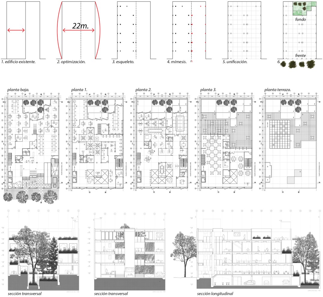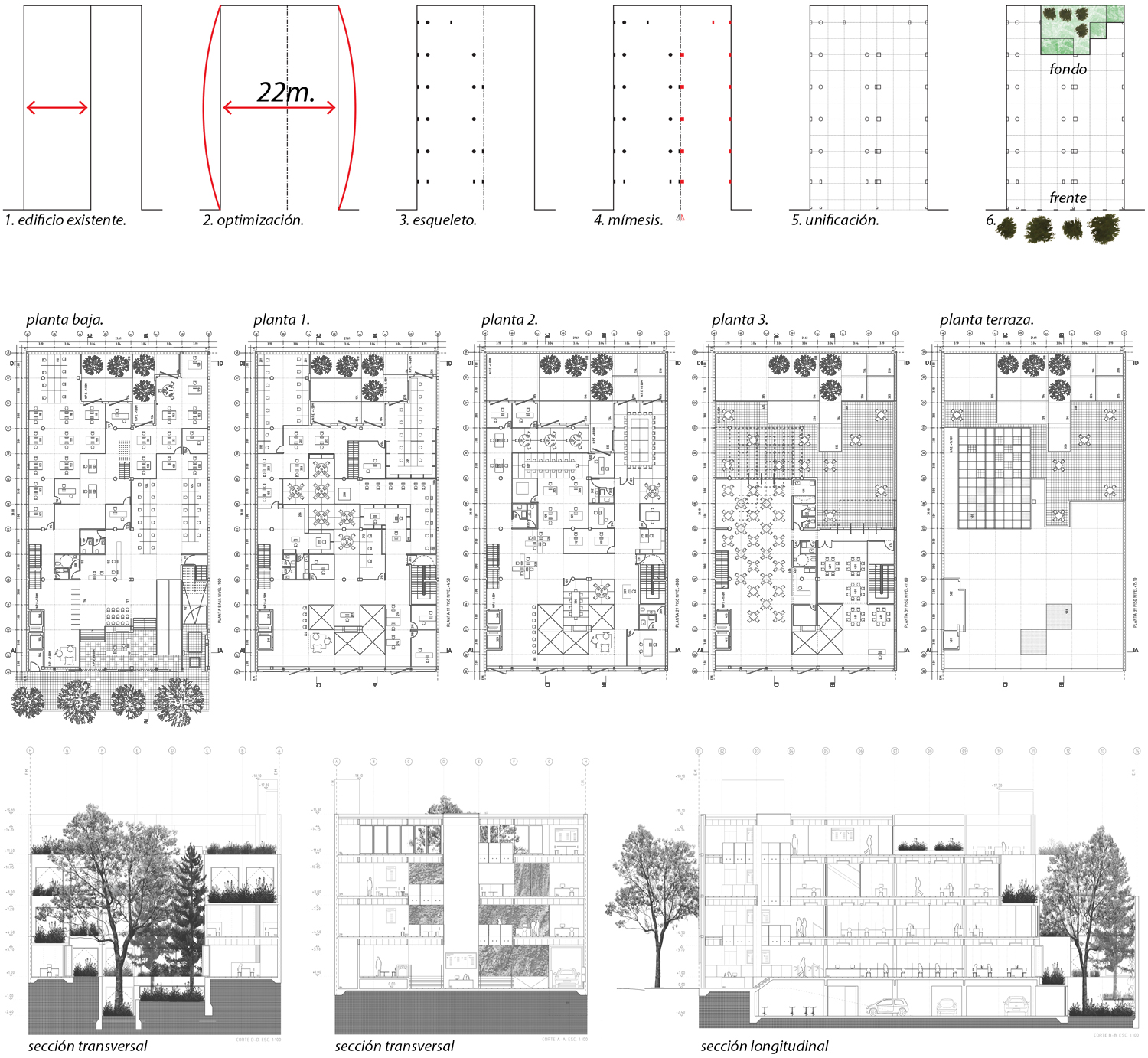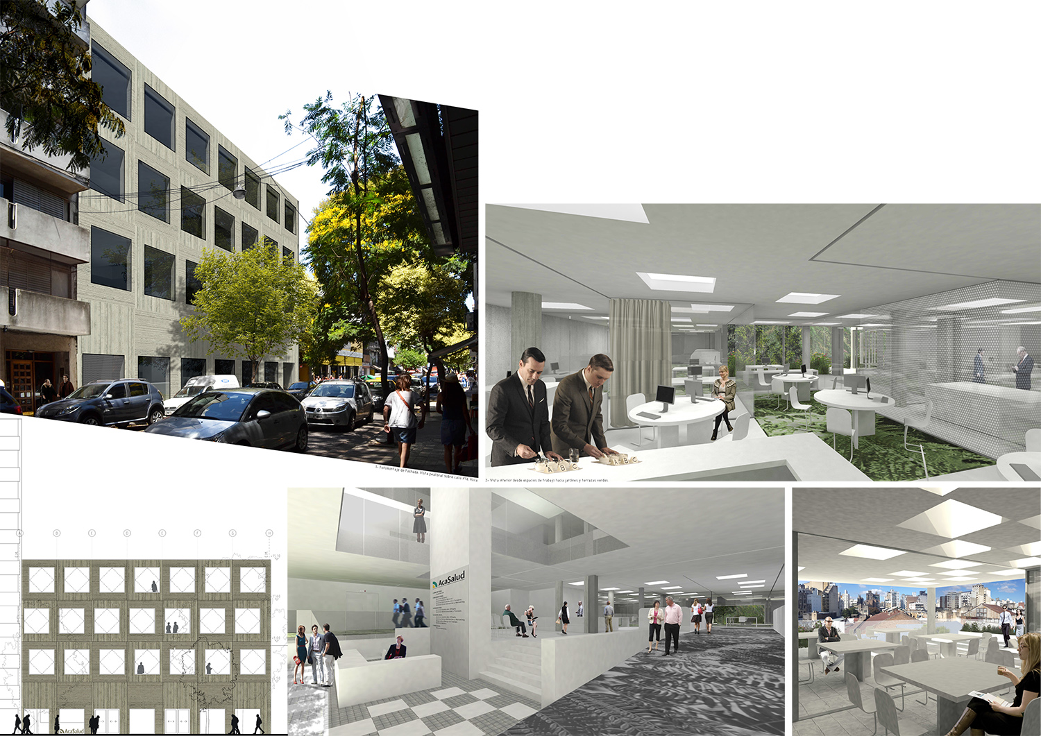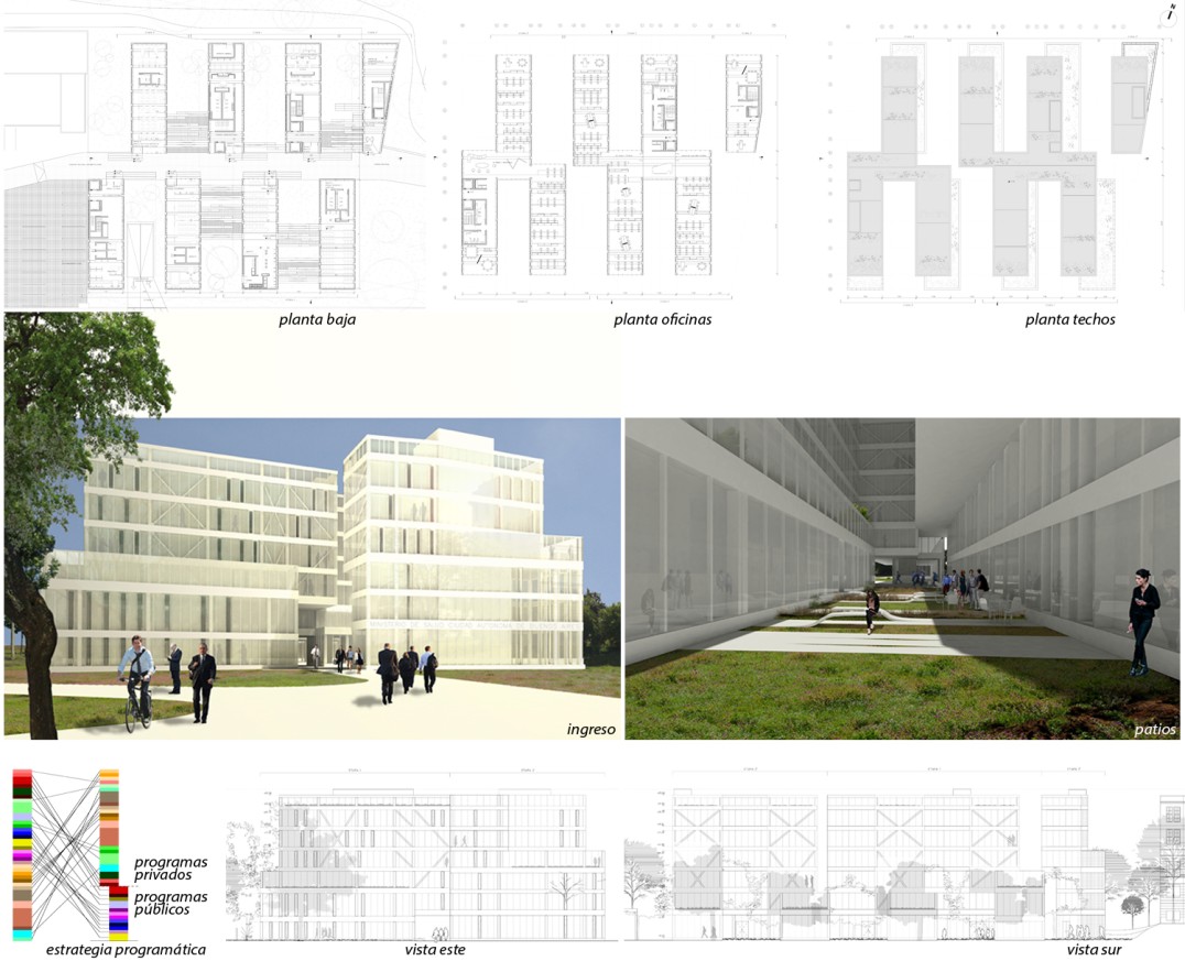 El edificio se piensa siguiendo la tipología “edificios de oficinas” que se caracterizan por contar con un núcleo circulatorio y de servicios que conectan y sirven los distintos niveles de planta libre, lo que permite múltiples variantes de disposiciones y divisiones interiores. Así mismo, el volumen semi exento garantiza, por medio de las calibradas distancias hasta las medianeras, la apropiada ventilación e iluminación natural de la planta optimizando el uso de la superficie construida. La disposición de los patios mínimos reglamentarios según el nivel de los locales que ventilan, posibilita divisiones de hasta ocho oficinas independientes garantizando rentabilidad. Las plantas libres habilitan las múltiples divisiones en cada nivel y acercan la propuesta a las intenciones explicitas en las bases de ofrecer al mercado inmobiliario distintas unidades según tamaños y jerarquías. Es decir, la flexibilidad permite la readaptación de los espacios para distintos usos futuros.