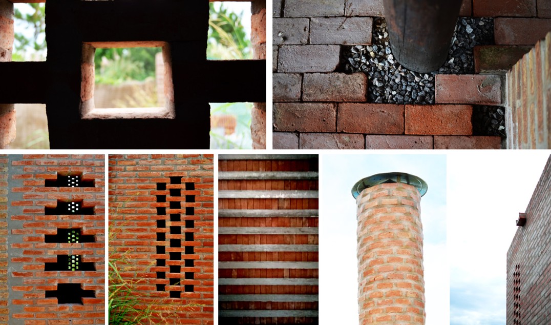 El acabado de ladrillo tanto en los muros como en el techo enfatizan la idea de volumen monolítico desde el exterior, mientras que en el interior los acabados blancos de muros y cielorrasos potencian la precepción de la espacialidad interior. Las ventanas están dispuestas enmarcando vistas precisas y registrando los cambios de luz a lo largo del día.