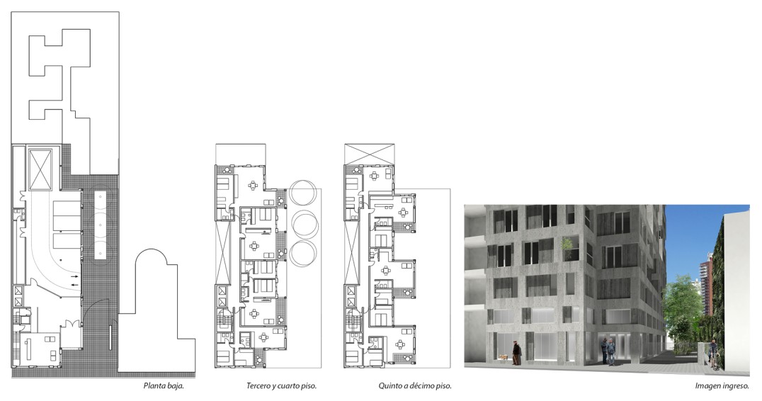 Ubicación/Location Rosario, Provincia de Santa Fe, Argentina. Type Residential building. Program Private residences. Type plan 1 bedroom, 2 bedrooms and 2 bedrooms plus apts. TotalArea 1785 m2 Work Commissioned Design Development. Status Delivered. Year 2016 Client Confidential. Team 2(A) María Eva Contesti, Guillermina Iglesia. Collaborators María José Manzi, Virginia Florez, Alejandro Perriard.