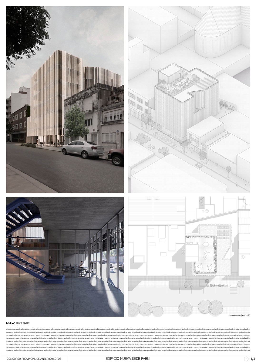 Partiendo de las intenciones expresadas en las bases de lograr un edificio como hito urbano que identifique a FAENI y CESGAR como dos instituciones de gran importancia en la región, y teniendo en cuenta las características del contexto tanto construido como cultural, presente y futuro, se propone un edificio de volumetría exenta que a través del uso creativo de materiales genéricos como el hormigón, el vidrio y la chapa galvanizada, logre una imagen icónica reconocible.
