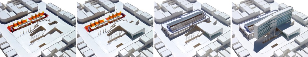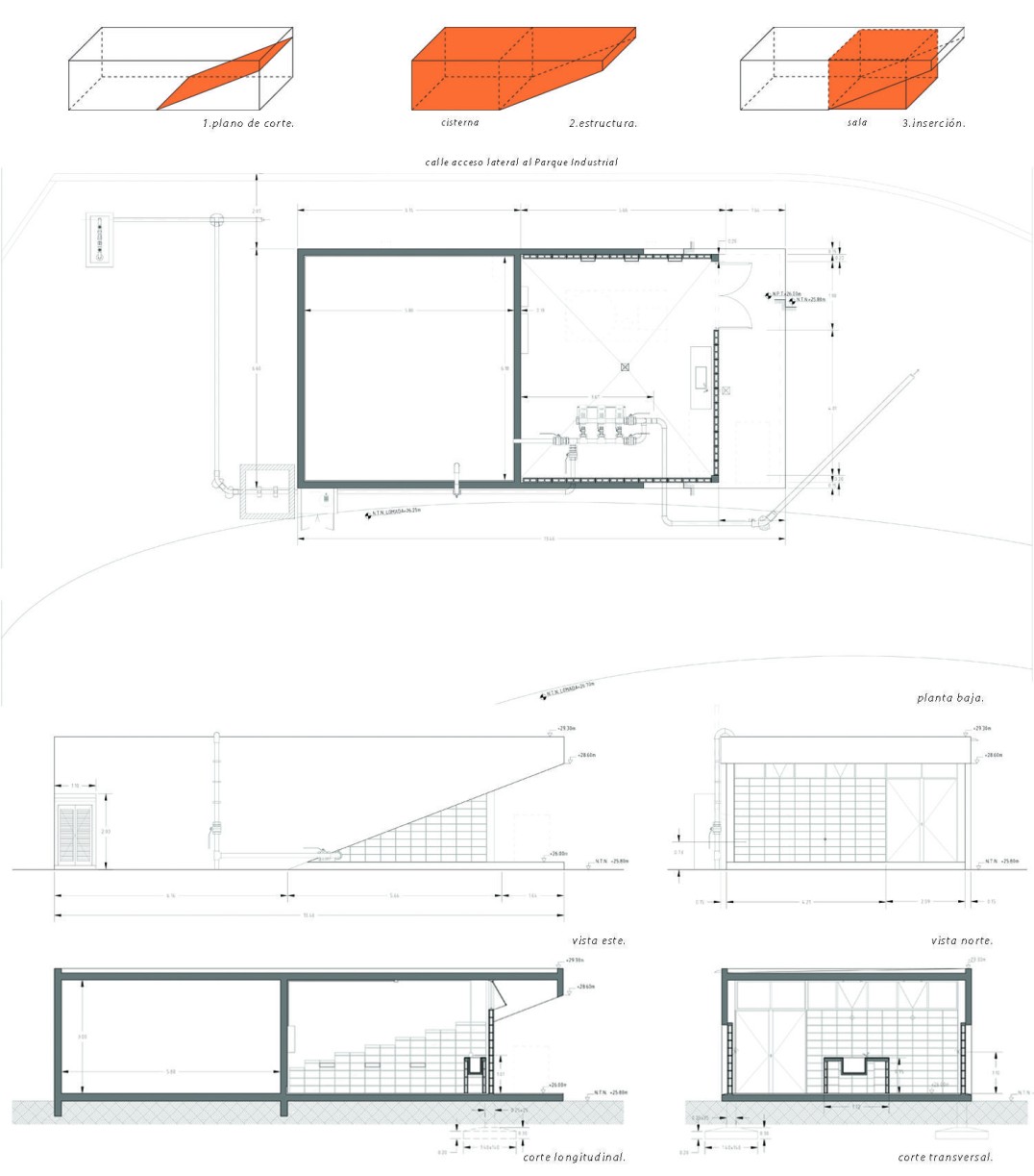 Los edificios se generan a partir de los dos pórticos de ingreso vehicular y peatonal. Los ejes transversales definen las superficies a ocupar a ambos lados de la calle. Cada pórtico afecta la altura del volumen enfrentado. Los panos de cubierta se constituyen a partir de la unión de las aristas proyectadas. Los volúmenes adicionados completan el conjunto posicionándose paralelos a la calle flanqueando y profundizando el ingreso.