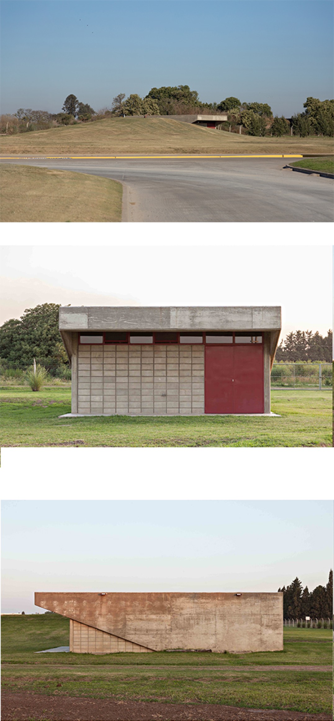 La Sala de máquinas es un volumen de hormigón armado atravesado por un plano de corte diagonal que arma el ingreso.