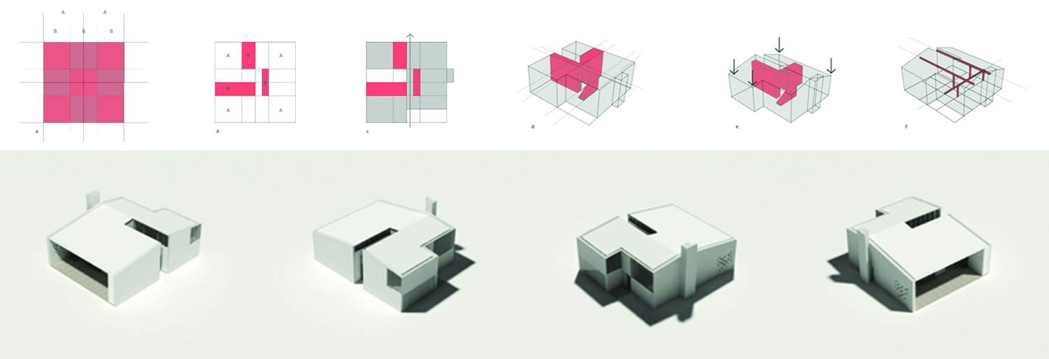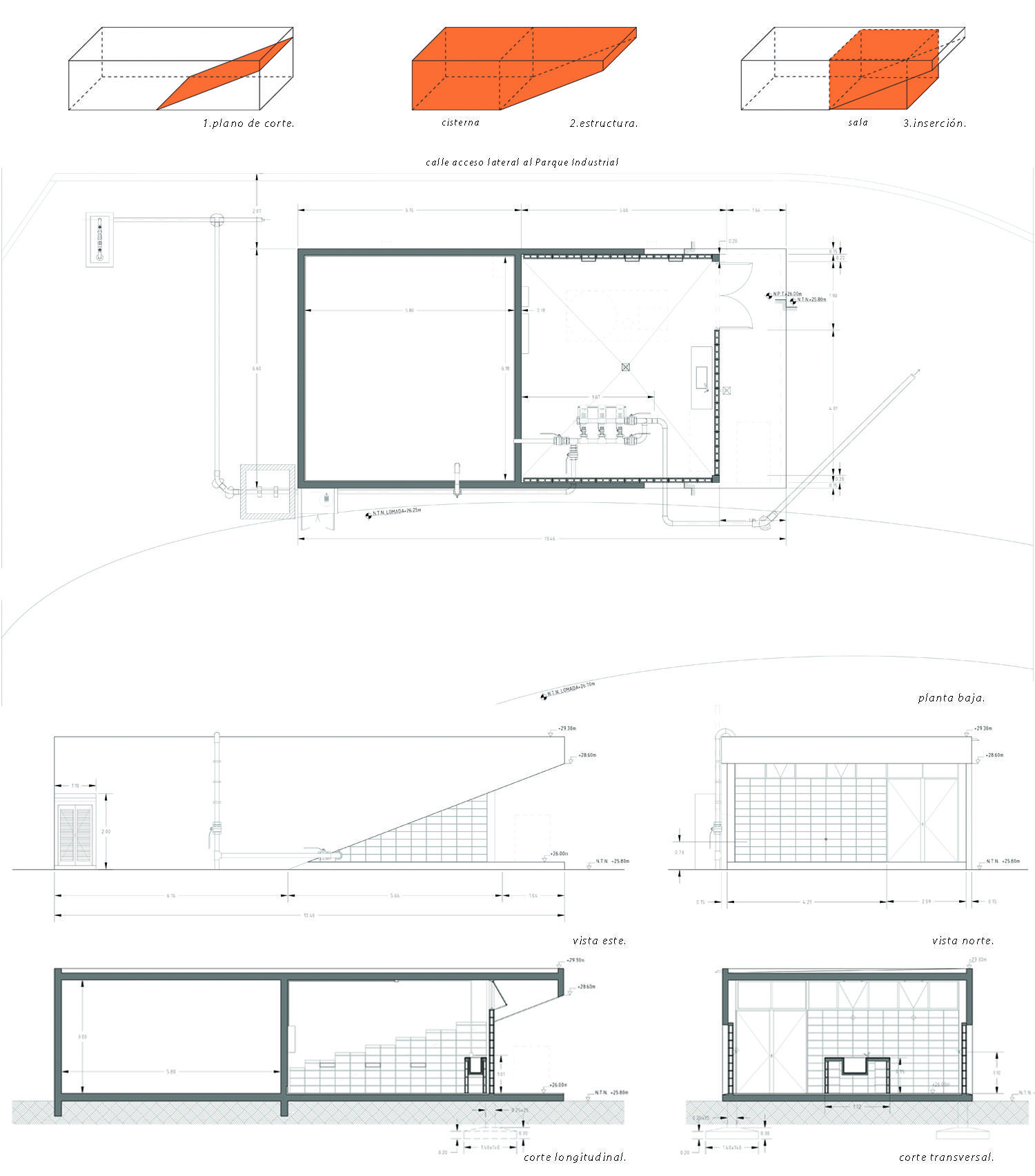 The buildings are generated by the position of two gates, one vehicular and one pedestrian. The transversal axes define the occupancy surfaces at both sides of the access road. Each gate affects the height of the opposing volume. The roof planes are formed by the union of the projected edges. The added volumes complete the composition by positioning parallel to the access road deepening the entrance experience.