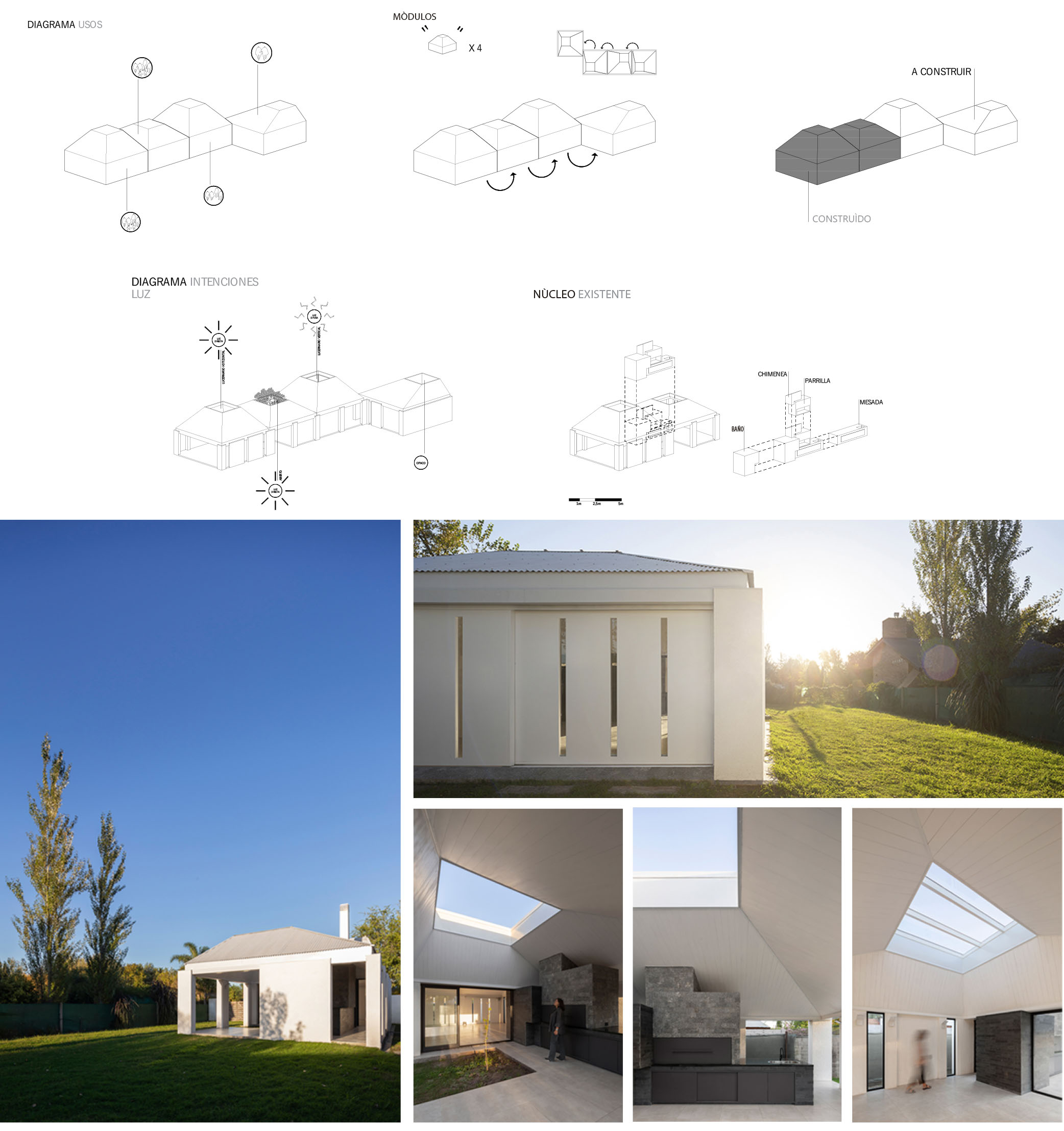 El proyecto completo es una vivienda de 196 m2 para residencia permanente y consta de cuatro unidades espaciales diferenciadas de acuerdo a su uso. Con el propósito de facilitar la construcción en etapas, el diseño propone una única unidad espacial que se repetirá y rotará de acuerdo a los requerimientos programáticos. Las dos primeras unidades construidas son el garage, que servirá además de quincho de invierno, y la galería o quincho abierto.